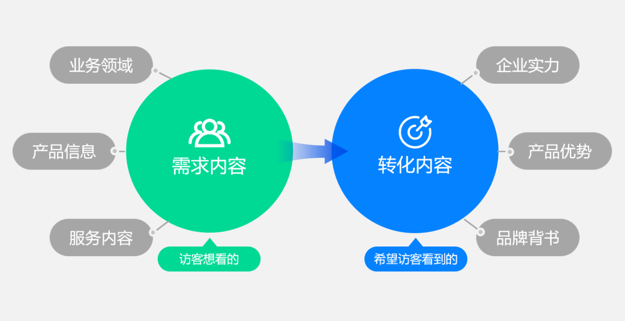 那么,我们要将访客最关注的网站内容放在最显眼的位置吗?大多数企业官网的确是这么做的。满足访客浏览需求就能促进访客选择我们吗?其实不然,我们除了必须满足访客浏览需求之外,更要主动展示企业核心竞争力的内容。大部分「需求内容」难以给访客留下符号性记忆,且这类内容与同行网站上的内容相似度极高,我们需要更多思考的是,如何将扎堆于「需求内容」的流量导向「转化内容」上。